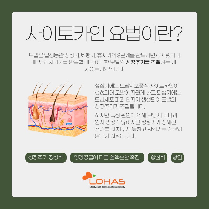 참고로 사이토카인이란 모발의 성장 주기를 조절해 주는 것을 말하는데요. 모발은 일생 동안 성장기와 퇴행기, 휴지기의 3단계를 반복하며 자랐다 빠지고 자라기를 반복한답니다. 성장기에는 모낭세포 증식 사이토카인이 생성되면서 모발이 자라게 되고, 퇴행기에는 모낭세포 파괴 인자가 생성되면서 모발의 성장 주기가 조절되는데요. 그러나 특정 원인에 의해 모낭세포 파괴 인자의 생성이 많아지게 되면 성장기가 정해진 주기를 다 채우지 못하게 되면서 퇴행기로 전환되어 탈모가 시작되는 것입니다.