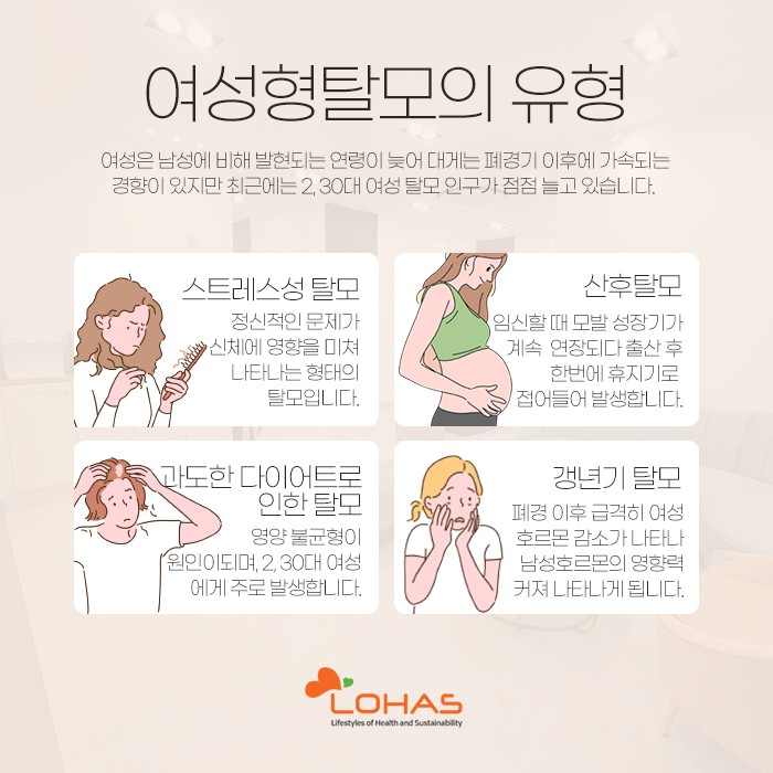 남성 호르몬에 대한 민감성이 유전되거나 폐경으로 갱년기 호르몬에 이상이 생겨서, 임신과 출산의 영향으로 인해, 갑상선 질환이나 난소 질환을 앓고 있어서, 음주나 다이어트 약물로 인한 부작용으로 인해, 잦은 파마와 염색에 의해, 과도하게 스트레스를 받게 되면서 나타나게 되는데요.