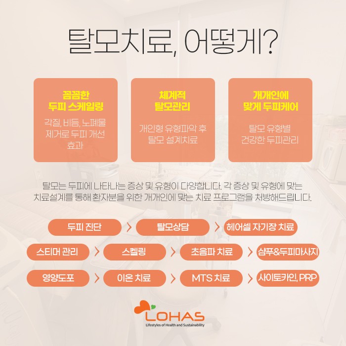 그렇기에 점점 심해지는 탈모로 인해 고민이 많으시다면 또는 의심이 되는 상황이라면 이제 로하스의원으로 내원하셔서 여의도탈모치료 이전에 자세히 진단부터 받아보시기 바라겠습니다.