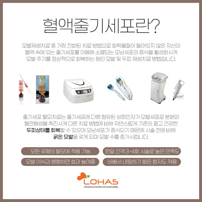 또 영등포탈모치료 방법으로 혈액 줄기세포 치료가 있는데요. 화학 물질이 들어있지 않은 자신의 혈액 속에 있는 줄기세포를 이용해서 소멸되는 모낭세포의 증식을 활성화시키는 방법을 말합니다. 모발 주기를 정상적으로 회복하는데 도움을 받아보실 수 있는데요.