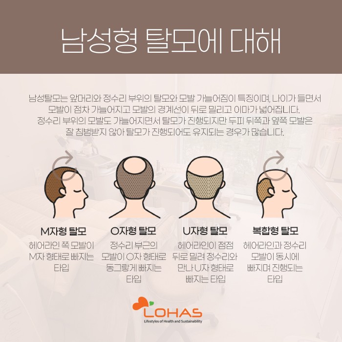 M자형 탈모라면 헤어라인 쪽 모발이 M자 형태로 빠지게 되고, O자형 탈모라면 정수리 부분의 모발이 O자 형태로 동그랗게 빠지게 됩니다. 또 U자형 탈모라면 헤어라인이 점점 뒤로 밀리면서 정수리와 만나 U자 형태로 빠지게 되고, 복합형 탈모라면 헤어라인과 정수리 부위의 모발이 동시에 빠지게 된답니다.