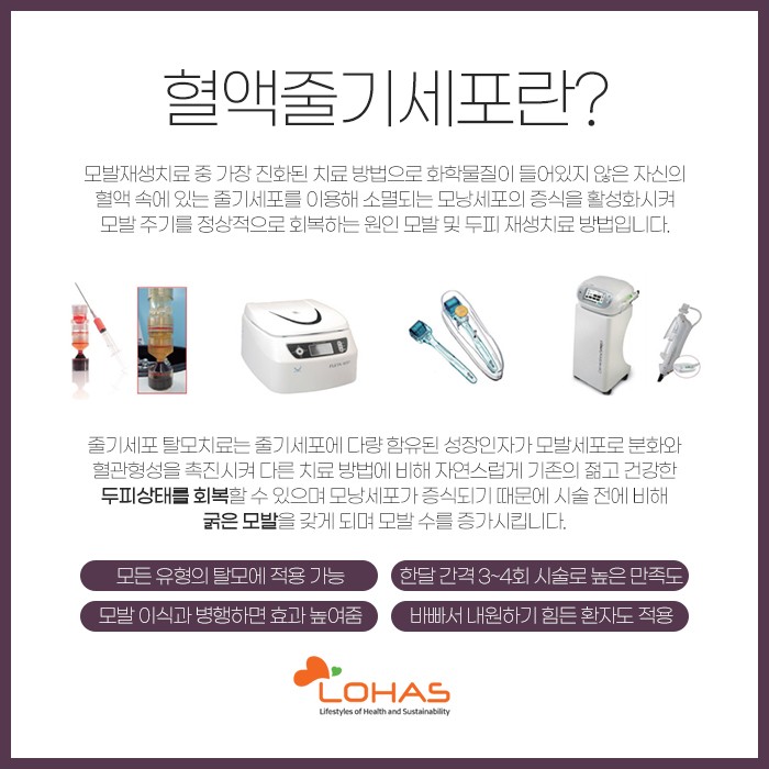 이러한 여의도탈모 치료 방법 중 혈액 줄기세포 치료에 대해 살펴보자면 화학 물질이 들어있지 않은 자신의 혈액 속에 있는 줄기세포를 이용한 방법을 말한답니다. 이로 하여금 소멸되는 모낭세포의 증식을 활성화시켜서 모발의 주기를 정상적으로 회복하는데 도움을 받아 보실 수 있습니다.
