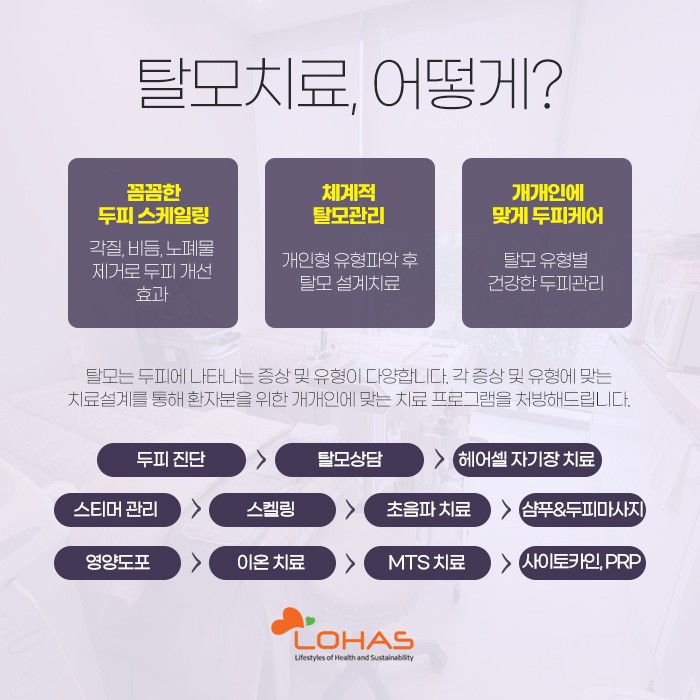 그리고 이를 토대로 헤어셀 자기장 치료와 스티머 관리, 스케일링, 초음파 치료, 샴푸 및 두피 마사지, 영양 도포, 이온 치료, MTS 치료, 사이토카인 및 PRP 치료를 통해서 도움을 드리게 되는데요.
