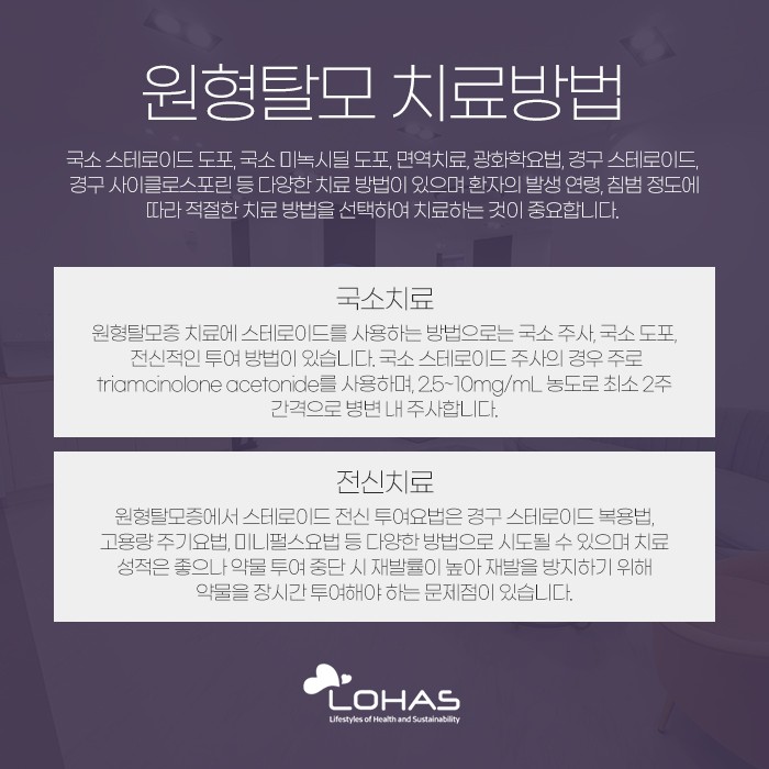 국소 치료는 국소 스테로이드 주사가 대표적인데 주로 2.5~10mg/ml의 농도로 최소 2주 간격으로 병변내 주사된답니다. 또 전신 치료는 경구 스테로이드 복용법과 고용량 주기요법, 미니펄스 요법 등 여러 가지 방법이 시도될 수 있는데요. 치료의 성적은 좋은 편이지만 약물 투여를 중단하게 되면 재발률이 높기 때문에 다시 재발하는 것을 방지하기 위해서는 약물을 장시간 투여해야 한다는 문제가 있습니다.