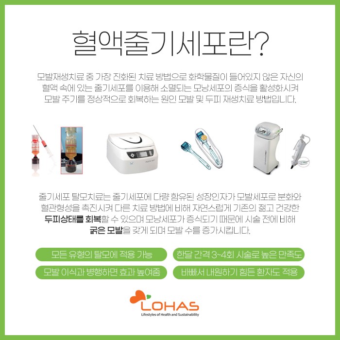 이러한 혈액 줄기세포 치료는 화학 물질이 들어있지 않은 자신의 혈액 속에 있는 줄기세포를 이용한 방법인데요. 소멸되는 모낭세포의 증식을 활성화시켜 모발 주기를 정상적으로 회복하는데 도움을 받아보실 수 있습니다.