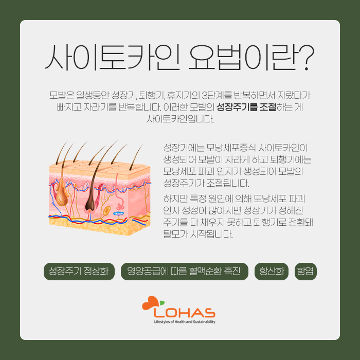 그리고 사이토카인에 대해 말해보자면 모발의 성장주기를 조절해 주는 것을 말한답니다. 모발은 일생 동안 성장기와 퇴행기, 휴지기의 3단계를 반복하며 자랐다 빠지고 자라기를 반복하는데 성장기에는 모낭세포 증식 사이토카인이 생성되면서 모발이 자라게 된답니다.