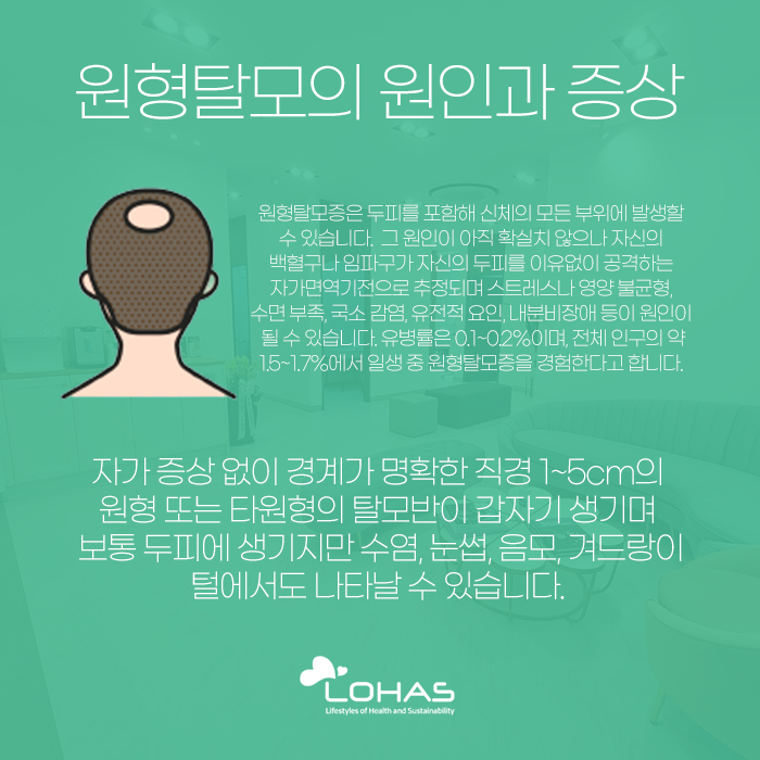 그리고 이러한 탈모 중에서 원형 탈모에 대해 이야기를 해보자면 잘못 건드리면 더욱 커질 수 있는데요. 자가 증상 없이 경계가 명확한 직경 1~5cm의 원형 또는 타원형 탈모반이 갑자기 생기게 된답니다. 보통 두피에 생기는 경우가 많지만 수염이나 겨드랑이 털 등에서도 나타날 수 있습니다.