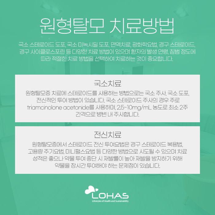 국소 치료는 국소 스테로이드 주사가 대표적인데 주로 2.5~10mg/ml인드로 최소 2주 간격으로 병변 내 주사하게 됩니다. 또 전신 치료는 경구 스테로이드 복용법과 고용량 주기요법, 미니펄스법 등 여러 가지 방법이 시도될 수 있는데요. 치료의 성적은 좋은 편이지만 약물 투여를 중단하게 될 경우 재발률이 높기 때문에 다시 재발하는 것을 방지하기 위해서는 약물을 오랜 시간 투여해야 한다는 문제가 있답니다.