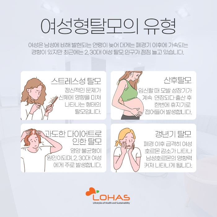 과도한 다이어트로 인한 탈모는 잘못된 다이어트 때문에 발생한 영양 불균형의 원인이 되어 나타나게 되는데요. 외모에 관심이 많은 20~30대의 젊은 여성에게 주로 나타난답니다. 또 갱년기 탈모는 호르몬에 의한 탈모입니다. 폐경 이후 급격히 여성 호르몬이 감소되어 나타나게 되는 것인데요. 여성 호르몬이 급격히 감소한 만큼 상대적으로 남성 호르몬의 영향력이 커지면서 발생하게 된답니다. 특히 탈모 유전자를 가지고 있다면 진행되는 속도가 빨라집니다.
