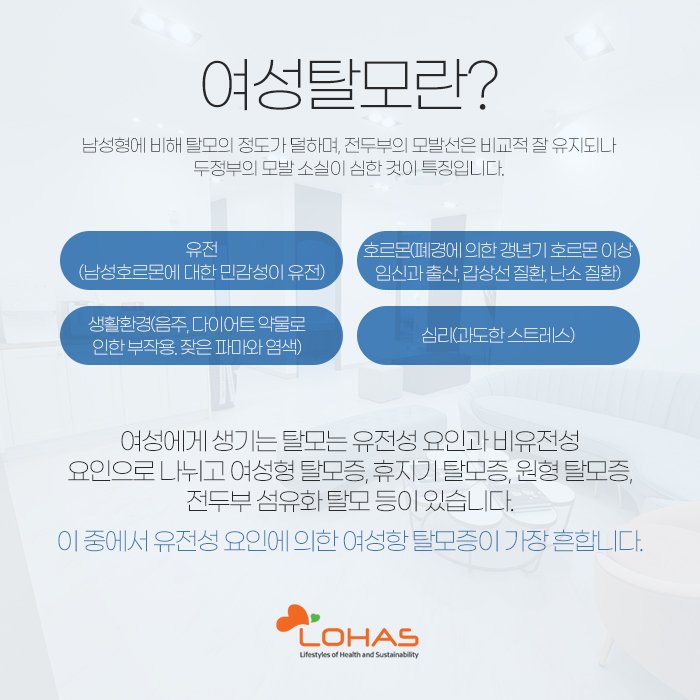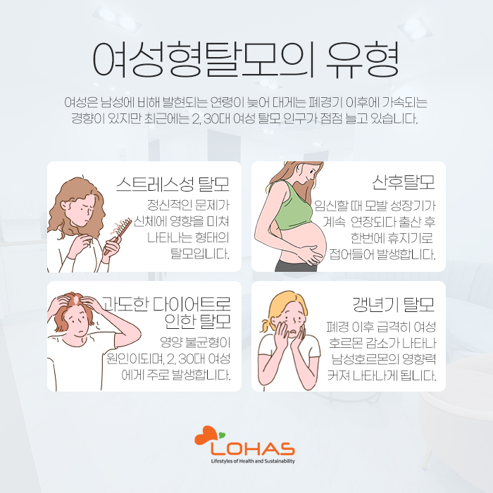 그리고 여성은 남성과 비교했을 때 탈모가 발생하는 연령이 늦은 편입니다. 보통 폐경기 이후에 발생하여 가속화되는 경향이 있는데요. 하지만 요즘에는 20~30대의 여성에게 탈모가 발생하는 경우가 늘고 있답니다.