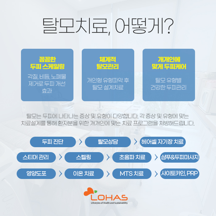 또 영등포탈모병원은 이를 토대로 헤어셀 자기장 치료와 스티머 관리, 스케일링, 초음파 치료, 샴푸 및 두피 마사지, 영양 도포, 이온 치료, MTS 치료, 사이토카인 및 PRP 치료를 진행하게 됩니다.