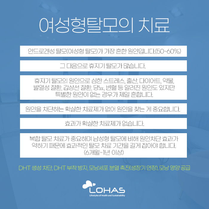 더욱이 여성형 탈모를 앓고 있다면 말할 것도 없습니다. 여성형 탈모는 치료 난이도가 높은 편인데요. 우선 여성형 탈모에 대해 설명해 보자면 남성 호르몬의 2차 대사물인 DHT의 영향으로 발생하게 되는 경우가 대부분이랍니다.