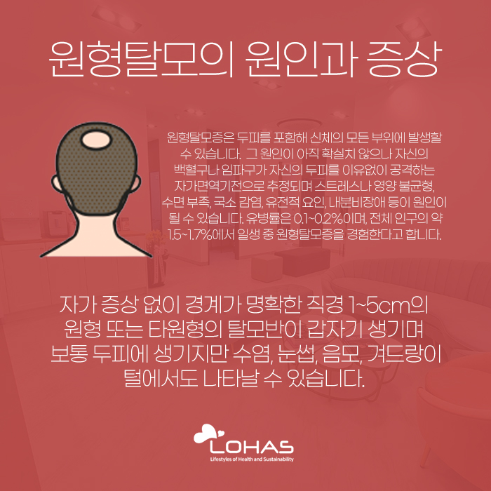 우선 원형 탈모에 대해 설명해 보자면 자가 증상 없이 경계가 명확한 직경 1~5cm의 원형 또는 타원형의 탈모반이 갑자기 생기게 되는 것을 말합니다. 보통 두피에 생기는 경우가 많지만 수염이나 눈썹, 겨드랑이에도 나타날 수 있는데요. 이렇게 원형 탈모가 발생하게 되는 원인은 확실히 밝혀지지 않았으나 자신의 백혈구나 임파구가 두피를 이유 없이 공격하는 자가면역기전으로 추정되고 있답니다.