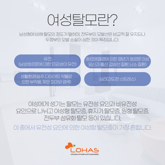 또 여성형 탈모가 발생하게 되는 원인에 대해 살펴보자면 남성 호르몬에 대한 민감성이 유전되거나 폐경으로 갱년기 호르몬에 이상이 생겨서, 임신과 출산의 영향으로, 갑상선 질환이나 난소 질환을 앓고 있어서, 음주 및 다이어트, 약물로 인한 부작용 때문에, 잦은 파마와 염색으로 인해, 과도하게 스트레스를 받게 되는 등이 있습니다.