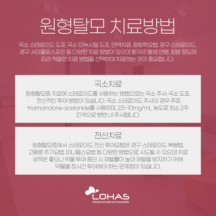 또 여의도탈모병원에서 이렇게 원형 탈모를 앓고 있는 경우에는 국소 스테로이드 도포와 국소 미녹시딜 도포, 면역 치료, 광화학 요법, 경구 스테로이드, 경부 사이클로스포린 등 여러 가지 방법을 통해 도움을 드리게 되는데요. 이때 환자분에게 탈모가 발생한 연령과 탈모가 침범한 정도 등에 따라서 적절한 방법을 선택하게 됩니다.