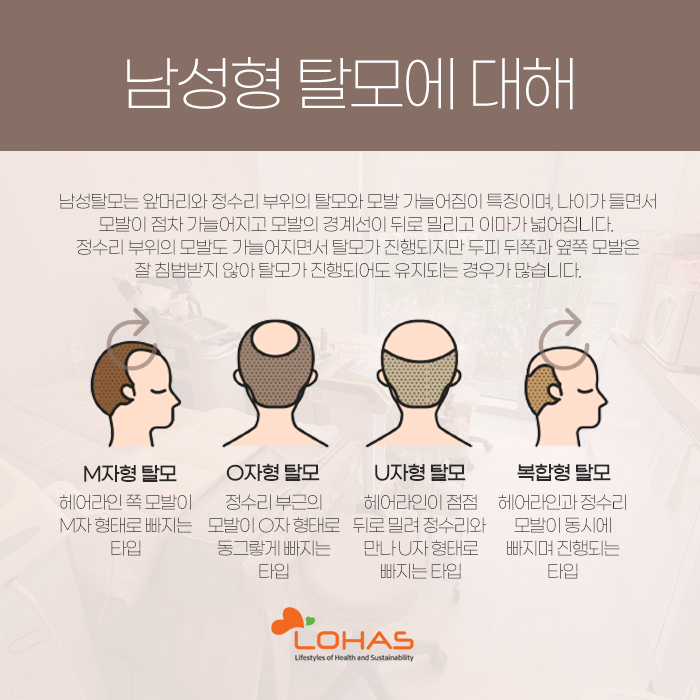 그리고 남성형 탈모는 M자형 탈모, O자형 탈모, U자형 탈모, 복합형 탈모가 있는데요. M자형 탈모는 헤어라인 쪽 모발이 M자 형태로 빠지게 되는 것을 말하고, O자형 탈모는 정수리 부분의 모발이 O자 형태로 동그랗게 빠지는 것을 말합니다. 또 U자형 탈모는 헤어라인이 점점 뒤로 밀리면서 정수리와 만나 U자 형태로 빠지게 되는 것을 말하고, 복합형 탈모는 헤어라인과 정수리 부위의 모발이 동시에 빠지면서 진행되는 것을 말하는데요.