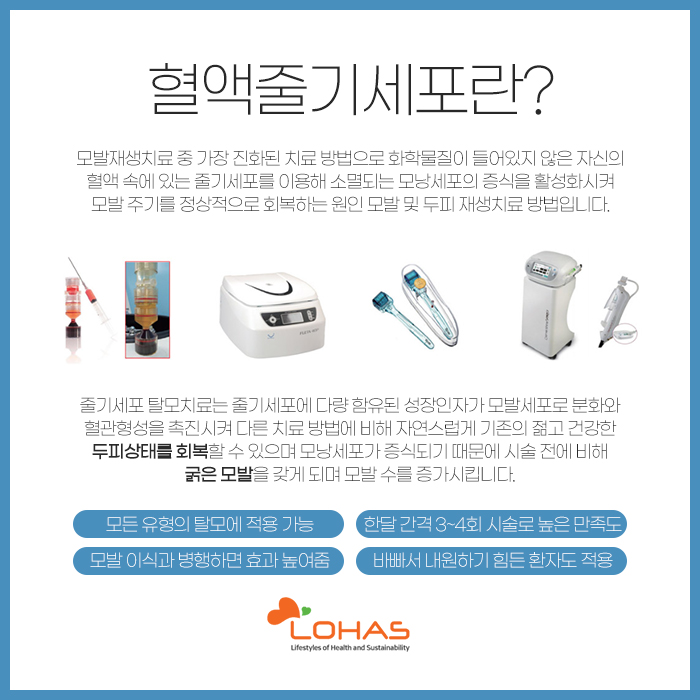 그리고 혈액 줄기세포는 화학 물질이 들어있지 않은 자신의 혈액 속에 있는 줄기세포를 이용한 방법이랍니다. 소멸되는 모낭 세포의 증식을 활성화시켜서 모발의 주기를 정상적으로 회복하는데 도움을 받아보시는 게 가능한데요.