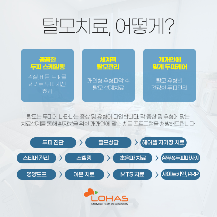 이를 토대로 헤어셀 자기장 치료와 스티머 관리, 스케일링, 초음파 치료, 샴푸 및 두피 마사지, 영양 도포, 이온 치료, MTS 치료, 사이토카인 및 PRP 치료를 통해 도움을 받아보실 수 있답니다.