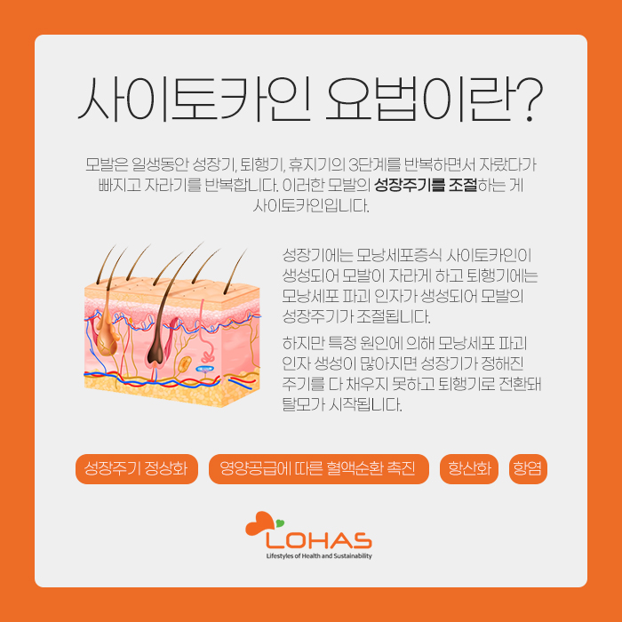 모발은 살면서 성장기와 퇴행기, 휴지기의 3단계를 반복하는데, 이러한 모발의 성장주기를 조절해 주는 것이 바로 사이토카인이랍니다. 성장기에는 모낭세포 증식 사이토카인이 생성되면서 모발이 자라게 되고, 퇴행기에는 모낭세포 파괴인자가 생성되면서 모발의 성장주기가 조절되는데요.