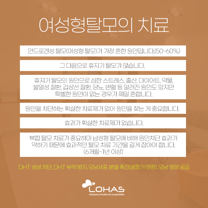 그리고 여의도탈모 여성형 탈모는 치료 난이도가 높은 편이라고 말씀을 드렸는데요. 그 이유는 여성형 탈모의 경우 원인을 차단하는 확실한 치료제가 없고, 또 효과가 확실한 치료제가 없기 때문입니다. 그래서 복합 탈모 치료를 통해 도움을 받도록 해야 하는데요. 이를 위해 DHT 생성 차단과 DHT 부착 방지, 모낭세포 분열 촉진, 모낭 영양 공급을 도움받게 된답니다.