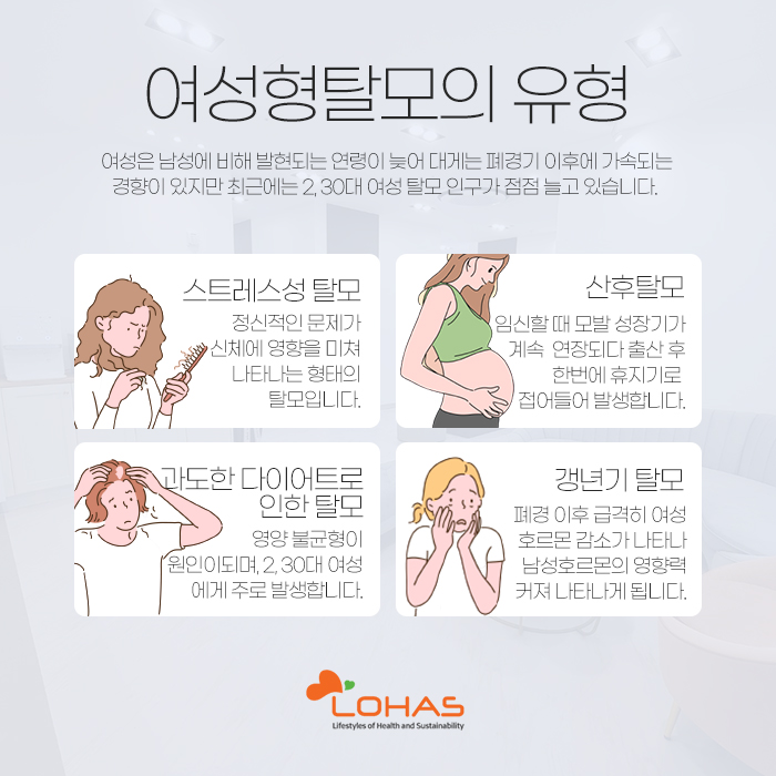 그리고 여성은 남성과 비교했을 때 탈모가 발현되는 연령이 늦는 편입니다. 보통 폐경기 이후에 빨리 진행되는 경향이 있는데요. 하지만 최근에는 20~30대의 여성에게 탈모가 발생하는 경우가 늘고 있는 상황입니다.