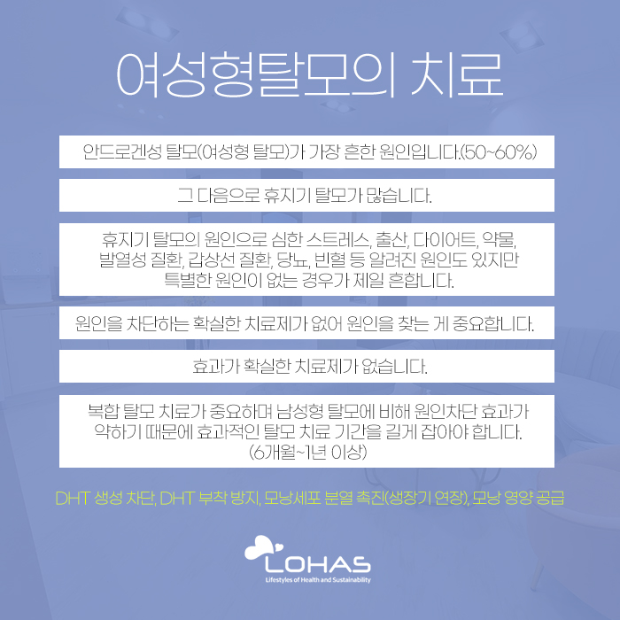 그리고 여성형 탈모의 경우에는 원인을 차단하는 확실한 치료제가 없고 효과가 확실한 치료제도 없답니다. 그래서 치료를 하는데 도움을 받고자 할 때는 복합 탈모 치료를 통해 도움을 받을 수 있는데요. 이러한 복합 탈모 치료는 DHT 생성과 DHT 부착 방지, 모낭세포 분열 촉진, 모낭 영양 공급으로 이루어져 있습니다. 또 복합 탈모 치료를 진행하게 될 때는 효과적인 탈모 치료 기간을 길게 잡도록 해야 하는데요. 보통 6개월에서 2년 이상이 걸린답니다.