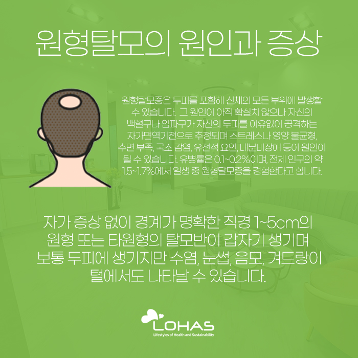 이렇게 원형 탈모가 발생하게 되는 이유는 확실히 밝혀지지 않았으나 자신의 백혈구나 임파구가 두피를 이유 없이 공격하는 자가면역기전으로 추정되고 있습니다. 또 스트레스를 많이 받거나 영양 불균형이 발생한 경우, 수면 부족인 경우, 국소 감염이 일어난 경우, 유전적인 요인이 있거나 내분비 장애 등으로 인해서도 나타날 수 있는데요. 유병률은 0.1~0.2%이고, 전체 인구의 약 1.5~1.7%가 일생을 살아가면서 원형 탈모를 경험하게 된다고 합니다.