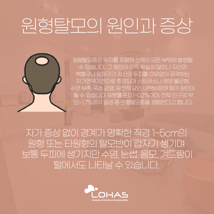 발생하게 되는 원인은 확실히 밝혀지지 않았으나 자신의 백혈구나 임파구가 두피를 이유 없이 공격하는 자가면역기전으로 추정되고 있습니다. 또한 스트레스를 많이 받거나 영양 불균형이 발생한 경우, 영양 부족인 경우, 수면 부족인 경우, 국소 감염이 발생했거나 유전적인 요인이 있는 경우 등으로 인해 나타날 수 있는데요.