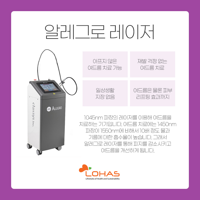 이러한 알레그로 레이저는 아프지 않게 여드름을 치료하는데 도움을 받을 수 있는 것은 물론 여드름이 다시 재발하지 않을까 걱정하지 않으셔도 된답니다. 또 시술을 받고 나서 일상생활을 하는데 지장을 주지 않는 것은 물론 여드름 외에도 피부를 리프팅 시키는데 도움을 받아보실 수 있습니다.