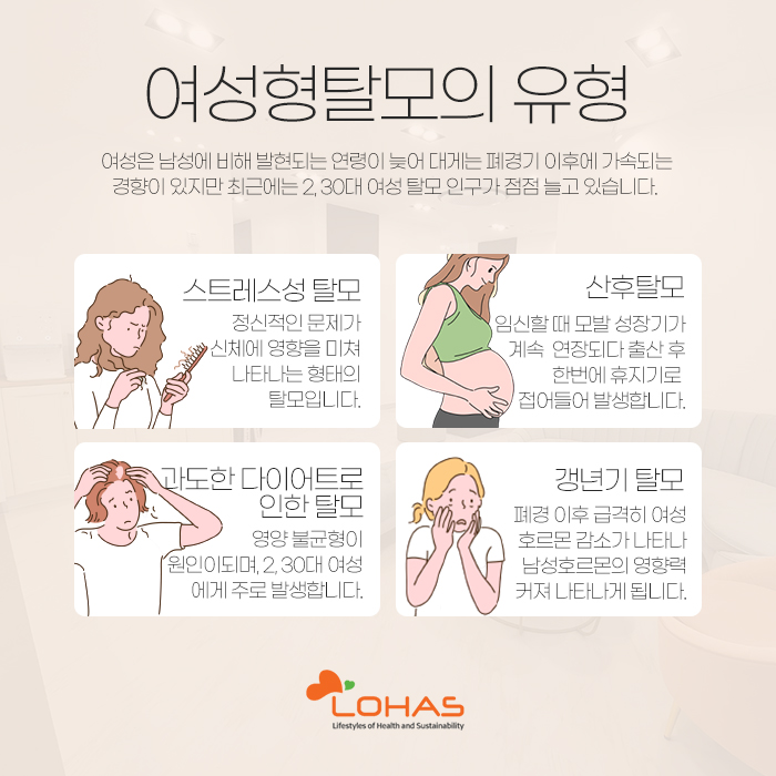 그리고 여성형 탈모는 그 종류를 스트레스성 탈모와 산후 탈모, 과도한 다이어트로 인한 탈모, 갱년기 탈모로 나눌 수 있는데요. 스트레스성 탈모는 정서적인 문제가 신체에 영향을 미치게 되면서 나타나게 되는 것을 말합니다. 여성의 사회 활동이 증가하면서 과다한 업무 스트레스 관리의 실패로 인해 발생하게 됩니다.
