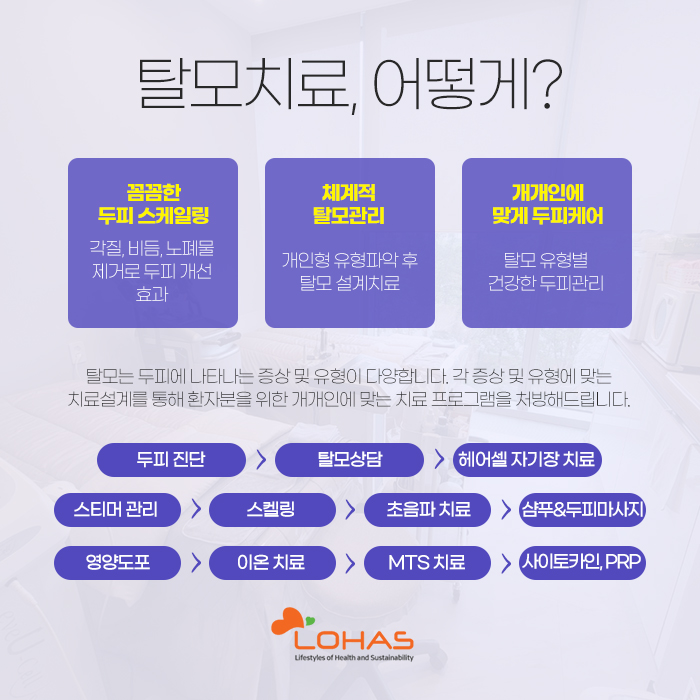 그리고 헤어셀 자기장 치료, 스티머 관리, 스케일링, 초음파 치료, 샴푸 및 두피 마사지 등을 그에 맞게 진행하게 되는데요.