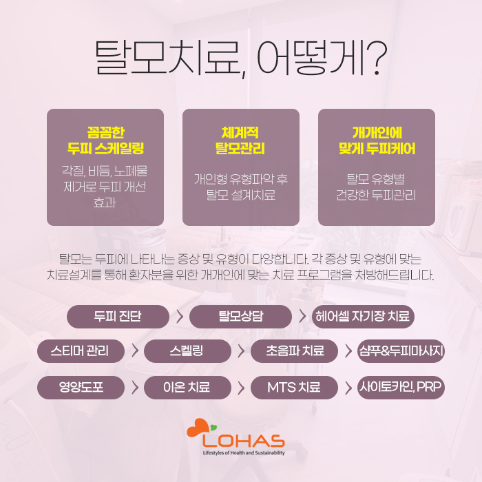 이 밖에도 여러 가지 방법으로 도움을 받아보실 수 있는데요. 이때 중요한 것은 계속 말씀드리고 있는 것처럼 자세히 진단부터 받는 것입니다. 그래야 자신의 상태에 맞는 방법으로 도움을 받을 수 있기 때문인데요. 참고로 자신에게 맞지 않는 방법으로 계속 치료를 시도하게 되면 나아지는 것이 아니라 시간만 낭비하게 되고, 그 사이 탈모가 더욱 진행되면서 상태가 악화되는 경우가 허다합니다.