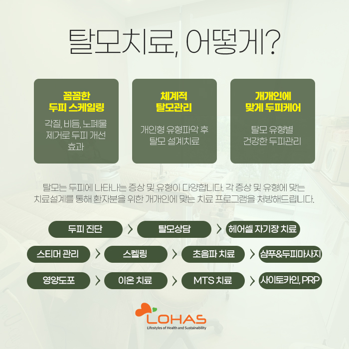 이를 기반으로 헤어셀 자기장 치료와 스티머 관리, 스케일링, 초음파 치료, 샴푸 및 두피 마사지, 영양 도포, 이온 치료, MTS 치료, 사이토카인 및 PRP 치료를 통해 도움을 받아보실 수 있습니다.